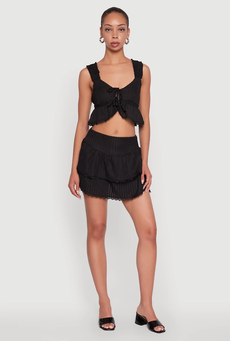 Step into the spotlight with the Haute Monde Shadow Stripe Tiered Skirt with Lace Detail. This mini skirt brings the perfect mix of flirty and fierce with its shadow stripe pattern and delicate lace embellishments. Whether you’re hitting a party or owning the night out, its classic fit and tiered design move with you for effortless style and confidence. Your new go-to for turning heads and feeling unstoppable. Mini length for a playful, eye-catching look Shadow stripe pattern adds subtle texture and style Tiered skirt design creates fun volume and movement Delicate lace detail for a touch of feminine charm Classic fit that flatters and feels comfortable all night Perfect for parties and nights out with friends Model Pictured Wearing Size S Height 5 ft 10 in, Bust 32 in, Waist 22 in, Hips 36 in Fits True To Size Measurements Full Length: 14 in Content and Care Material: 97% Polyester, 3% Spandex Care Instructions: Hand Wash Country Of Origin: Cambodia Rainbow Item Number 1413069398911 BLACK - 1413069398911001