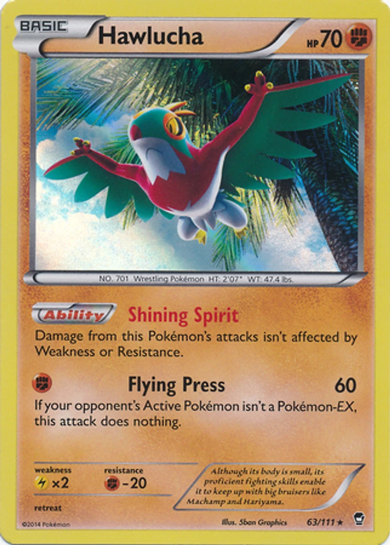 Set: Furious Fists Card Number: 63/111 Rarity: Holo Rare Illustrator: 5ban Graphics Weakness: Lightning HP: 70 Stage: Basic Card Type: Fighting Name: Hawlucha Finish: Holo Ability: Shining Spirit - Damage from this Pokmon's attacks isn't affected by Weakness or Resistance. Attack #1: F Flying Press (60) If your opponent's Active Pokemon isn't a Pokemon-EX , this attack does nothing. Manufacturer: The Pokemon Company