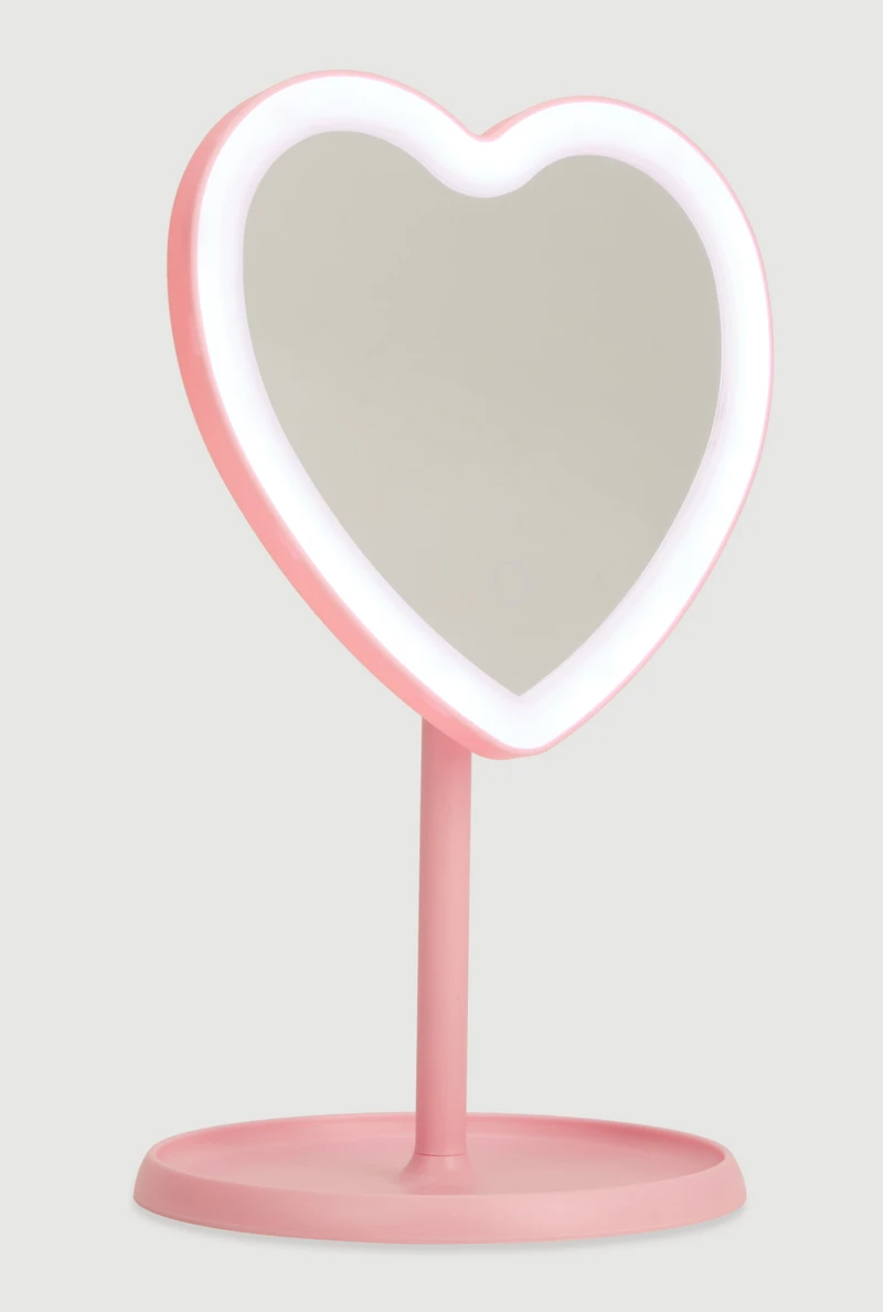 A heart-shaped vanity mirror designed for easy use with touch sensor activation and adjustable tilt for the perfect angle. It features built-in LED lights with three modes to customize brightness.
