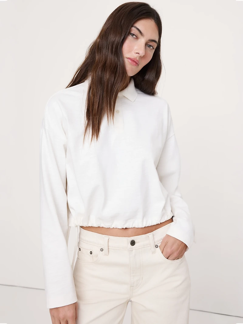A cute, cropped twist on the classic rugby polo, we added a drawstring to the hem to create the season's bubble silhouette and cut it in a heavier 100% cotton jersey with subtle, slub texture. Oversized fit: Extra room through chest, shoulders, and waist. Dropped shoulder seams. Polo collar with button placket. Straight hem with drawstring details. Oversized fit: Extra room through chest, shoulders, and waist. Dropped shoulder seams. Long sleeves. Cropped length. Model wears size XS.