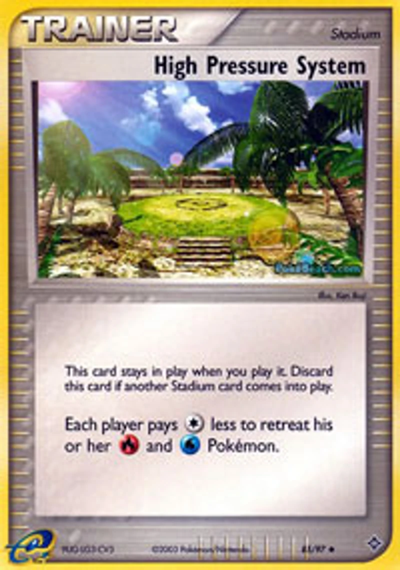 Set: EX Dragon Card Number: 85/97 Rarity: Uncommon Illustrator: Ken Ikuji Card Type: Trainer (Stadium) Name: High Pressure System Finish: Regular Card Text: Each player pays 1 less to retreat his or her R and W Pokemon. Manufacturer: The Pokemon Company