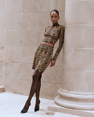 Fitted from the waist to the thigh, this high waisted mini skirt features a playful leopard print on a cozy sweater material. Pull on styling for easy wear.