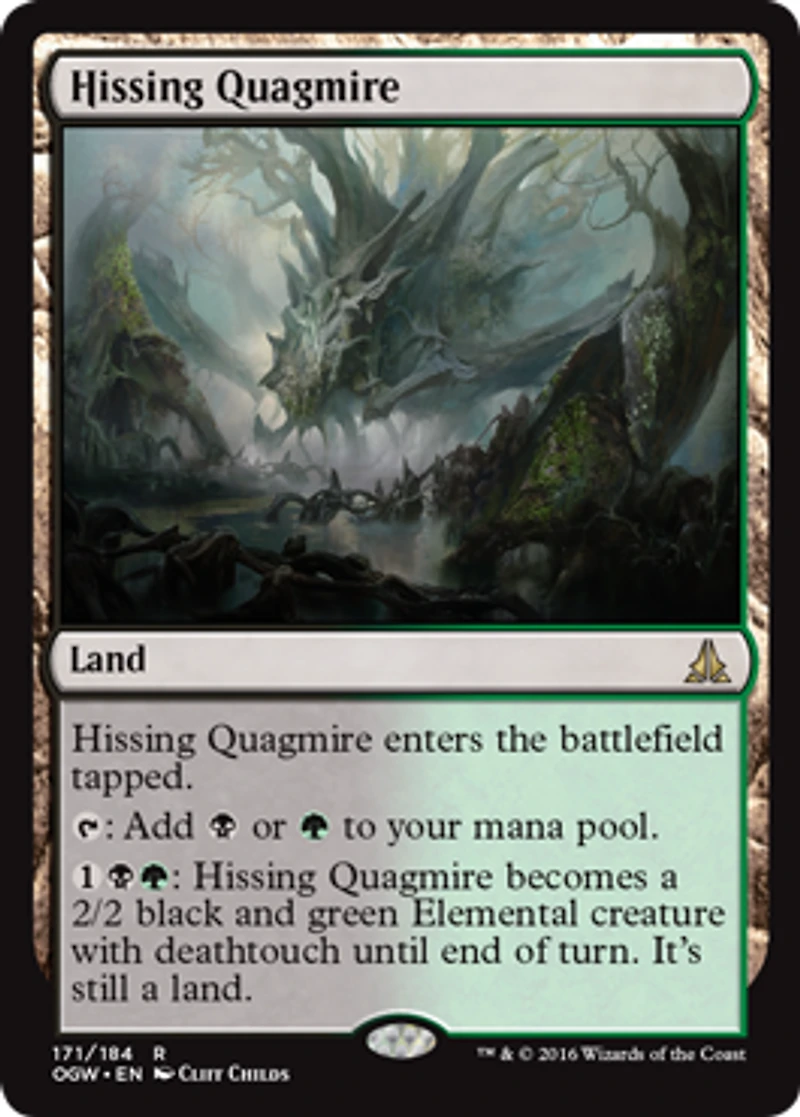 Hissing Quagmire enters the battlefield tapped. T: Add B or G to your mana pool. 1BG: Hissing Quagmire becomes a 2/2 black and green Elemental creature with deathtouch until end of turn. It's still a land.
