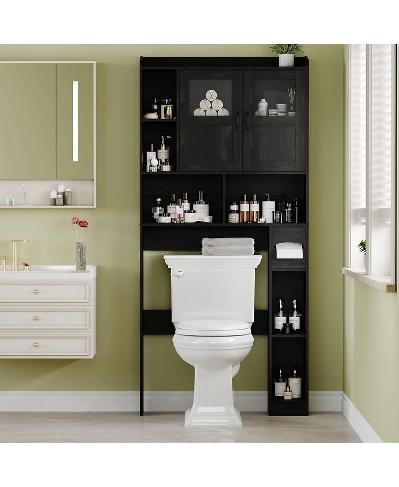 Bring more order to your bathroom with this 67.4 in tall over toilet storage cabinet, designed to make better use of vertical space that often goes unused, Open shelves keep towels, paper rolls, and daily essentials close by, while the glass door cabinet gives toiletries and other supplies a cleaner look, Adjustable shelves help fit tall bottles, folded linens, and smaller items with ease, Available in White and Black, this cabinet adds a simple modern feel to bathrooms, laundry rooms, and other compact spaces while helping counters and floor areas stay more open