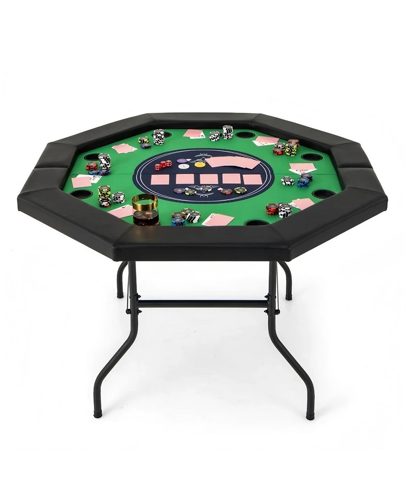 Experience the thrill of casino gaming at home with our 48"" octagon poker table, designed for 6-8 players. Its foldable design saves space and offers versatility for various occasions. Enjoy added comfort with cushioned armrests and secure cup holders. Built with a sturdy frame and casino-grade felt, it promises a seamless gaming experience.