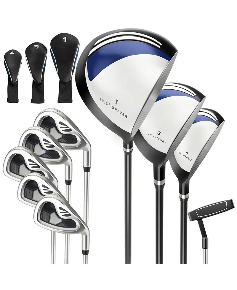 This complete 9-piece golf club set for men is ideal for right-handed golfers. It includes a variety of clubs to enhance your game, featuring an aluminum alloy driver, irons with zinc alloy heads, and a mallet putter. Designed for maximum control, forgiveness, and distance, this set provides a comfortable and stable experience. Whether you're a beginner or an experienced golfer, this set offers everything you need for a successful round of golf. Please note, the golf bag is not included.