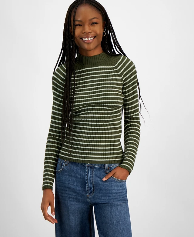 Hooked Up by Iot Juniors' Fine Gauge Mock-Neck Striped Sweater