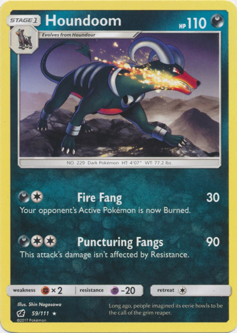 Set: Crimson Invasion Card Number: 59/111 Rarity: Rare Retreat Cost: 1 Weakness: Fighting HP: 110 Stage: Stage 1 Card Type: Darkness Resistance: Psychic Name: Houndoom Finish: Regular Attack #1: [1D] Fire Fang (30) Your opponent's Active Pokemon is now Burned. Attack #2: [2D] Puncturing Fangs (90) This attack's damage isn't affected by Resistance.