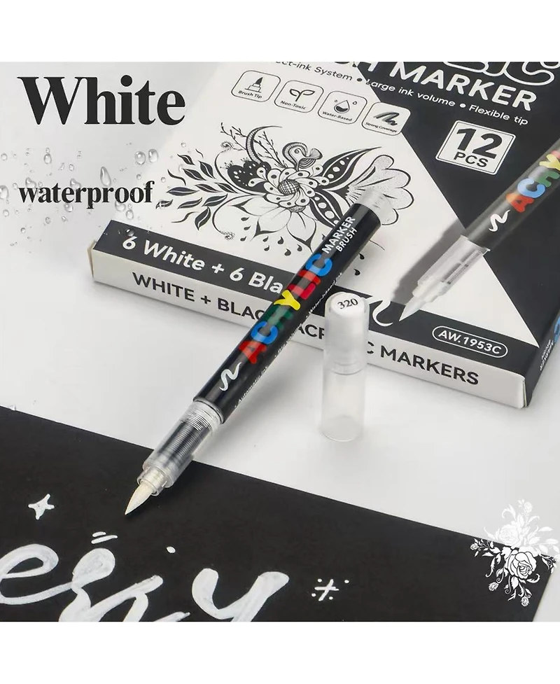 This 12Pcs White Acrylic Paint Pen set is a must-have for crafters and artists, featuring soft brush tips that deliver bold, versatile white color across a wide range of surfaces-from wood, metal, and rock to plastic, glass, canvas, and fabric. Unlike thin, streaky white markers that fail to stand out, this set solves 4 key pain points for creators: each pen holds high-opacity white acrylic ink that pops on both light and dark surfaces-no dull, transparent results the soft brush tips mimic traditional paintbrushes, allowing flexible strokes-from fine details to broad, blended fills the permanent formula bonds tightly to nearly any material, resisting fading, smudging, or peeling and the 12-pack quantity ensures you have enough supply for large projects or frequent use, with no mid-craft shortages. Suitable for ages 13 and up.