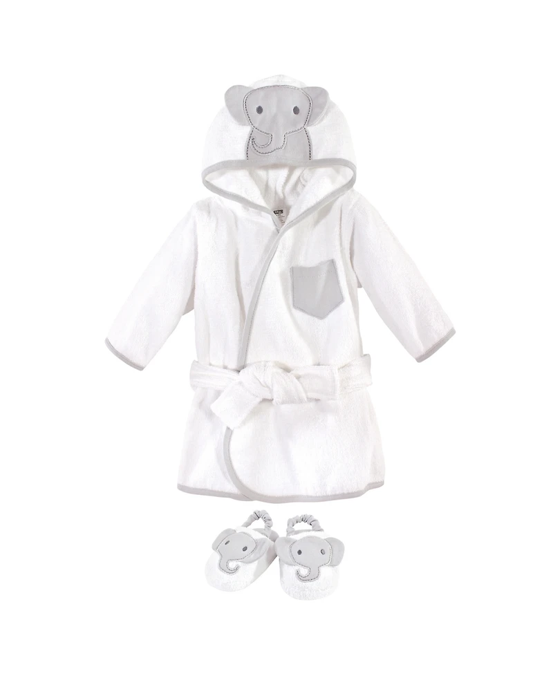 Hudson Baby animal hooded bath robe and slippers 2pc set is an adorable and practical accessory for after your baby's bath. Made of 100% cotton, our robe helps quickly dry baby, is soft and gentle on their skin and keeps them warm. Our robe has a large hood with animal face details that helps keep baby warm, cozy, and cute after a bath, along with a belt around the waist to ensure a snug and comfy fit. Hudson Baby Infant Cotton Animal Face Bathrobe and Slippers 2pc, Modern Elephant is a great baby essentials set for your little one.