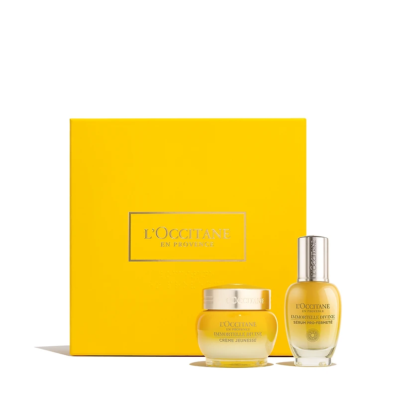 The power of Immortelle Super Extract a naturally - derived alternative to retinol. Unveil natural beauty and help fight visible signs of aging with our Immortelle Ageless Radiance Duo. Set Includes : Immortelle Divine Serum: Quickly absorbs to boost radiance and help fight visible signs of aging. Net wt.1 fl. oz Immortelle Divine Cream : An indulgent cream that helps fight 7 signs of visible aging including age spots. Net wt. 1.7 oz