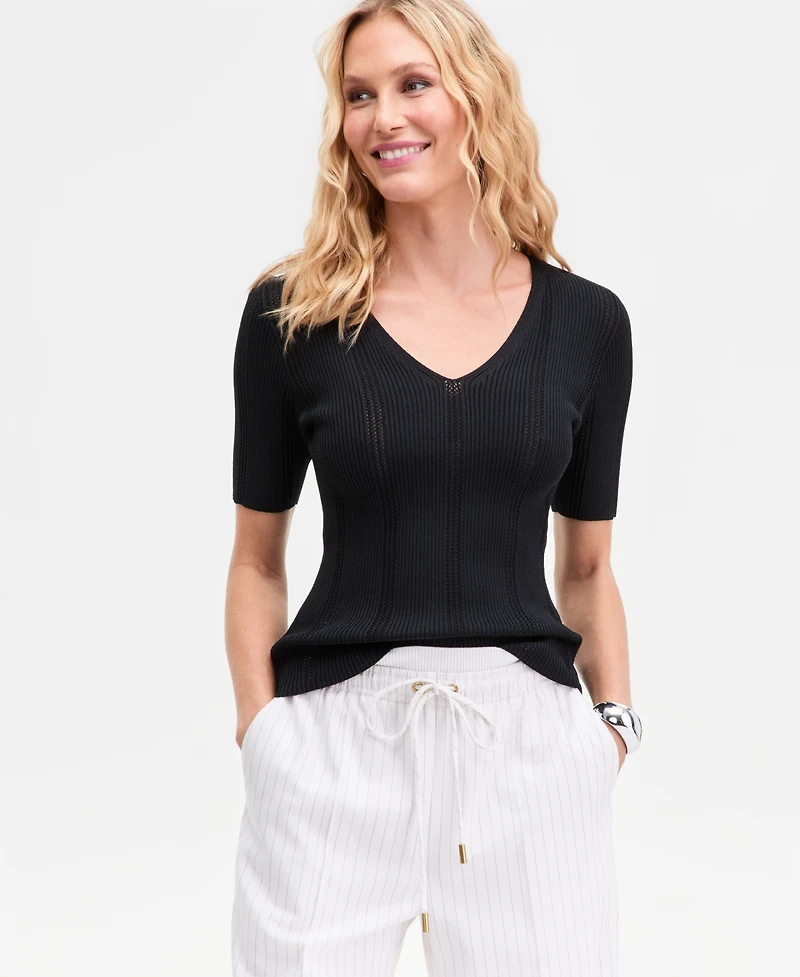 I.n.c. International Concepts Women's Short-Sleeve V-Neck Pointelle Rib Knit Sweater, Macy's Exclusive
