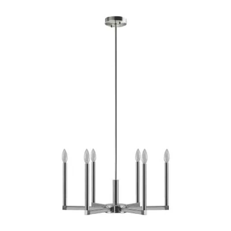 The ink+ivy chandelier offers a modern take on a traditional design. Featuring 6 uplights in a candle-inspired design, this chandelier flaunts a silver metallic finish for an elegant, eye-catching look.