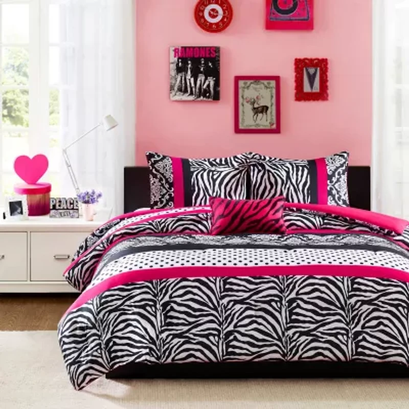 Make a statement in your bedroom with the spunky style of The Intelligent Design Gemma Zebra Comforter Set. The comforter flaunts a stripped motif of damask patterns, polka dots, and zebra prints in striking black, white, and pink colors to create a fierce and bold look. The 2 matching shams (1 in Twin/Twin XL) repeat the striking design of the comforter, while an oblong decorative pillow with zebra stripes adds the finishing touch. This comforter set uses an antimicrobial treatment that provides built-in freshness protection, reducing the growth of odor causing bacteria to keep fabric lasting longer.