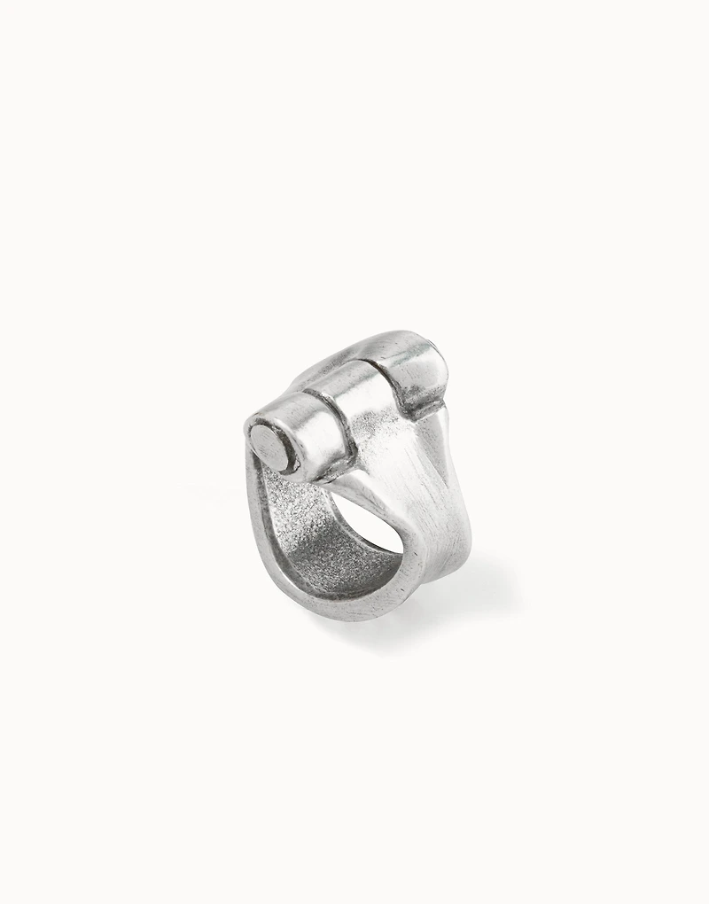 XL size silver plated metal ring with a lockable hinge and irregular thickness. Designed with a clear industrial inspiration, it is a jewel with a bohemian and independent spirit. A ring with UNOde50's resounding and robust style. Designed and handmade in Spain.