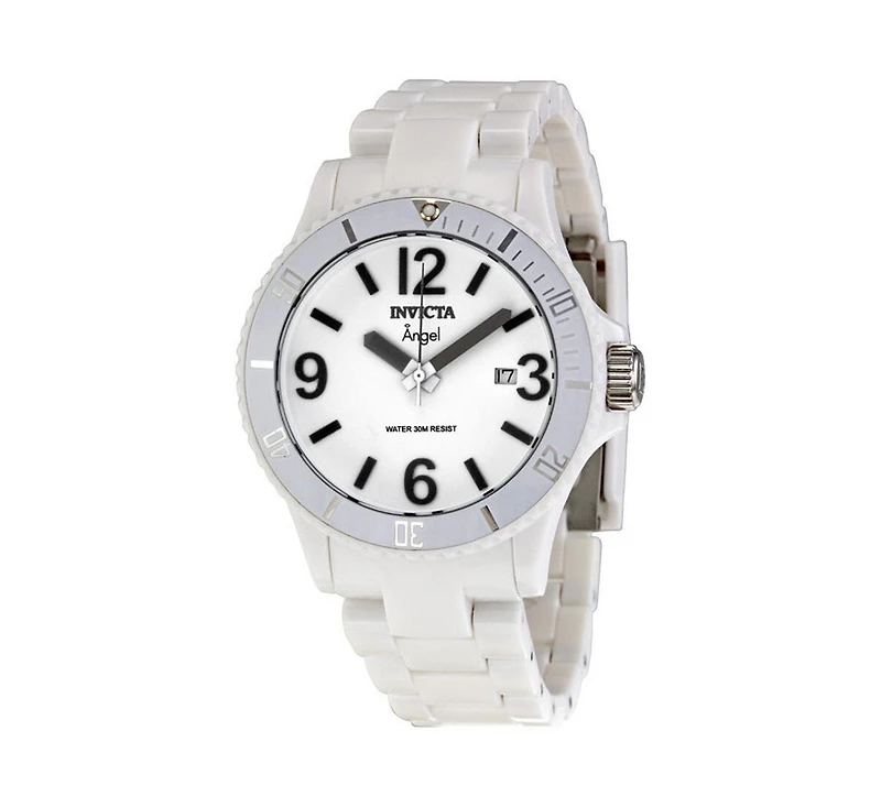 White plastic case with a white plastic strap. Unidirectional white plastic bezel. White dial with gunmetal hands and index hour markers. Arabic numerals mark the 3, 6, 9 and 12 o'clock positions. Dial Type: Analog. Date display at the 3 o'clock position. Ronda Caliber 505 quartz movement. Scratch resistant flame fusion crystal. Pull / push crown. Solid case back. Case size: 39 mm. Case thickness: 12 mm. Round case shape. Band width: 20 mm. Deployment clasp. Water resistant at 30 meters / 100 feet. Functions: date, hour, minute, second. Sport watch style. Invicta Angel White Messenger Ladies Watch 1207.