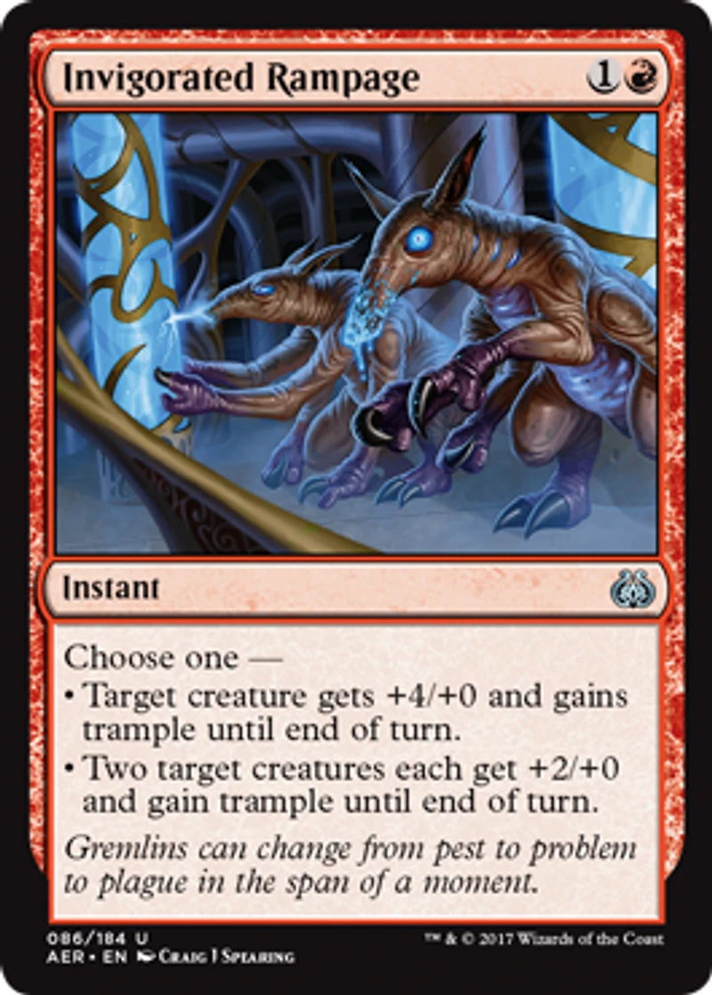 Color: Red Card Text: Choose one: Target creature gets +4/+0 and gains trample until end of turn. Two target creatures each get +2/+0 and gain trample until end of turn. Rarity: U Cost: 1R Card Type: Instant Artist: Craig J Spearing Name: Invigorated Rampage Finish: Foil Card Number: 86/184 Set Name: Aether Revolt