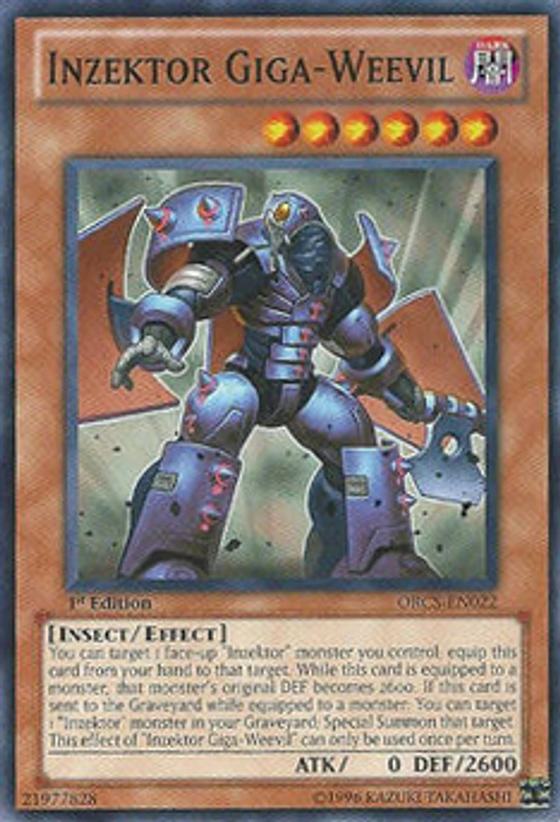that monster'soriginal DEFbecomes 2600. If this card is sent to theGraveyardwhile equipped to a monster: You cantarget1 "Inzektor" monster in yourGraveyardSpecial Summonthat target. This effect of "Inzektor Giga-Weevil" can only be used once per turn.