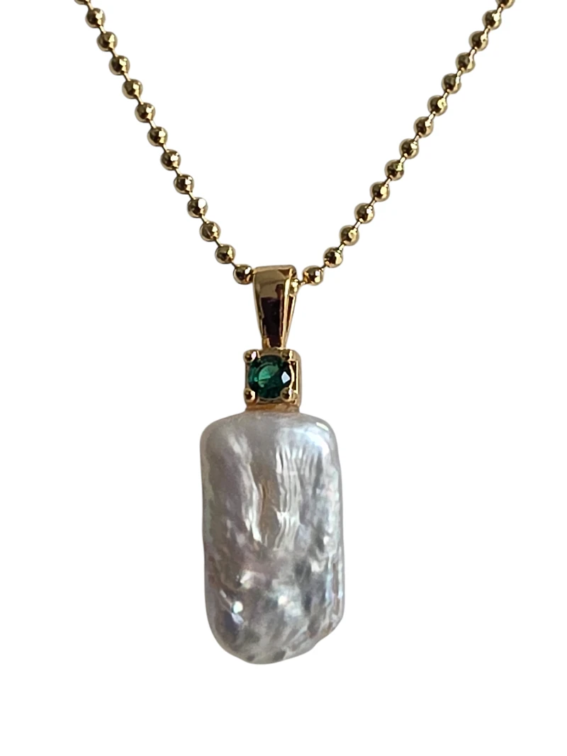 Elegant 20" necklace featuring lustrous pearls and a vibrant green charm, crafted from hypoallergenic 18K Brazilian goldfilled. The CALISTA combines timeless sophistication with modern design, perfect for everyday wear or special occasions. Goldfilled construction ensures durability and lasting beauty, while the hypoallergenic properties make it ideal for sensitive skin. A versatile piece that effortlessly transitions from casual to formal styling.
