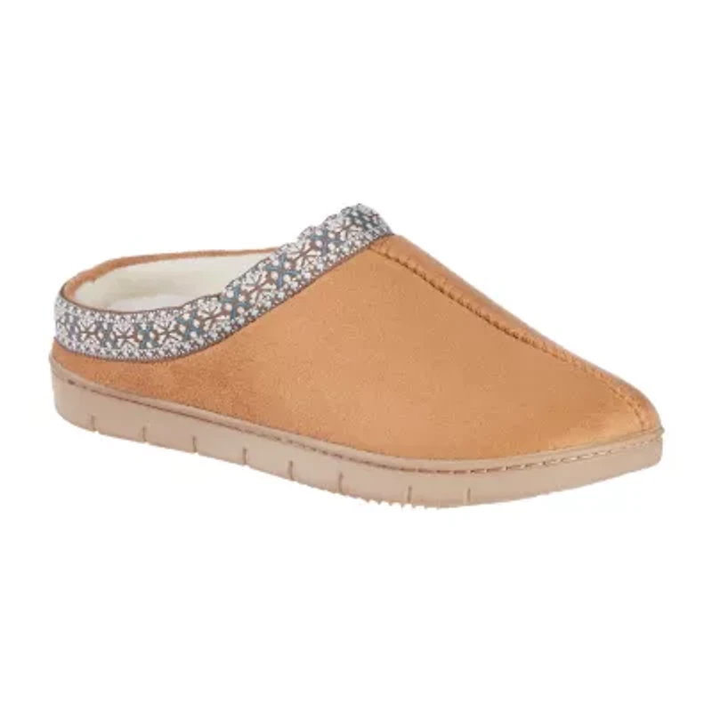 These Isotoner women's clog slippers have a cozy boho look and feel. This round closed-toe slip-on design is made from soft recycled faux suede and fleece with a patterned fabric trim and a flat platform rubber sole with grips for traction and support. Wear them with your favorite loungewear or PJs.