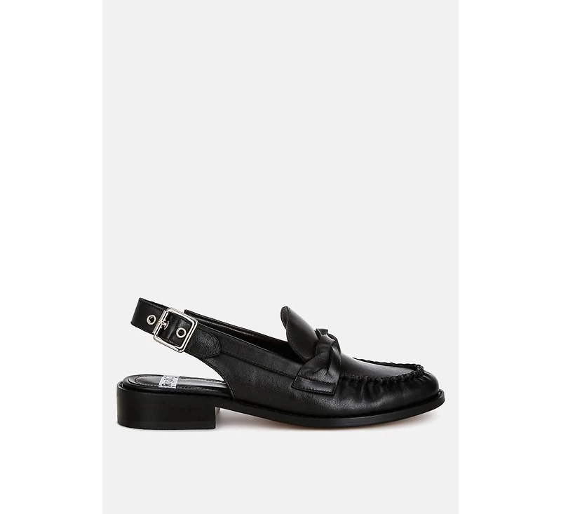 Crafted with high quality genuine leather the loafer sandals are a contemporary design exhibiting intrigue. The slingback fastening with the pin buckle assures a secure fit while the light cushion insoles cut strain.