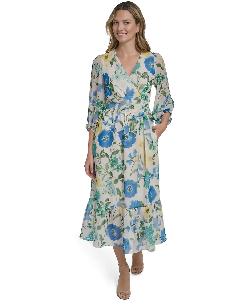 Jessica Howard Women's V-Neck Balloon Sleeve Surplice Tiered Midi Dress