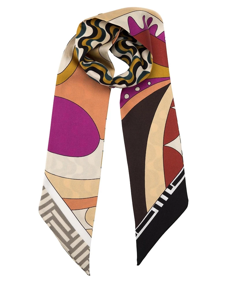 This twilly scarf features elegant geometric patterns in earth tones and greens. It s double sided which ensures a polished look however you choose to style it. Accent your handbag, create a distinctive wrist wrap, weave it through your hair, or add a refined touch at your neck. Handmade from the finest Italian silk twill, this versatile piece adds refined elegance to any ensemble.