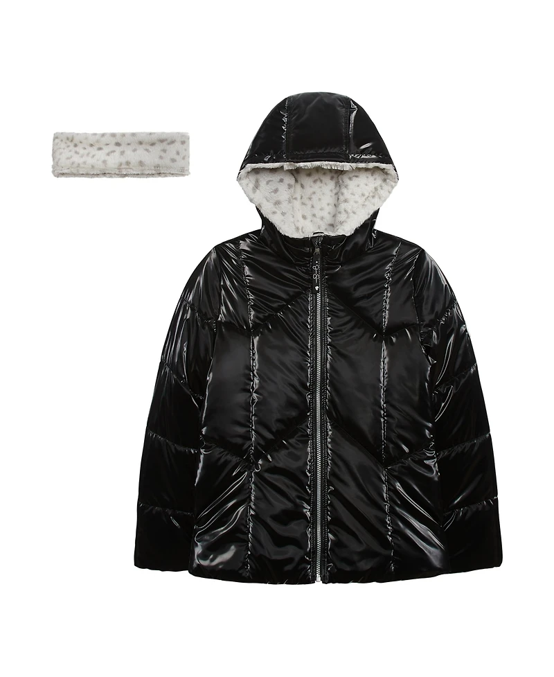 Jessica Simpson Girls' Puffer Jacket combines style and warmth with a reflective shine, faux -lined hood, and headband. Features easy zip closure, seam pockets, and hidden elastic wrists/hem for comfort. Water-resistant for weather protection. Perfect for winter elegance..