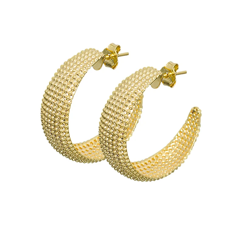 Elevate your look with JILL. The 46mm texture hoops are a must-have trendy addition to your wardrobe. Crafted with hypoallergenic 18k Brazilian goldfill, these earrings are both luxurious and gentle on your skin. Make a statement with this exclusive piece.