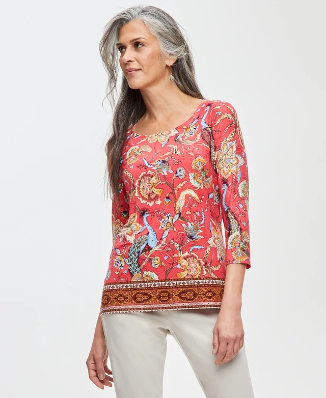 Jm Collection Women's Printed Scoop-Neck 3/4-Sleeve Top, Created for Macy's