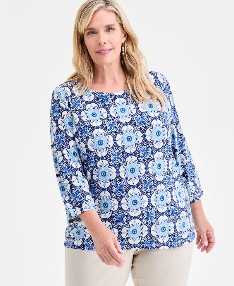Freshen your wardrobe with this chic plus size top from Jm Collection, a flattering 3/4-sleeve design detailed with a vibrant print and a swirling jacquard texture.