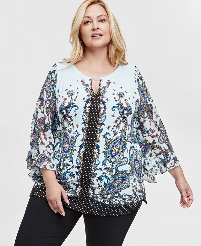 Jm Collection Plus Printed Flared-Sleeve V-Neck Top, Exclusively at Macy's