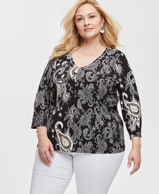 Jm Collection Plus Printed 3/4-Sleeve Top, Exclusively at Macy's