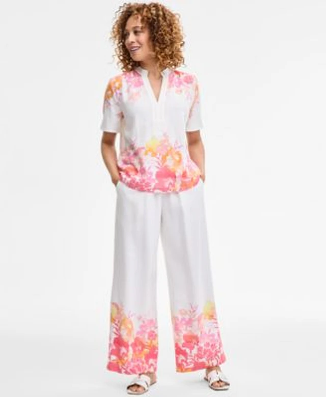 Jm Collection Womens Floral Linen Short Sleeve Top Floral Linen Wide Leg Pants Exclusively At Macys