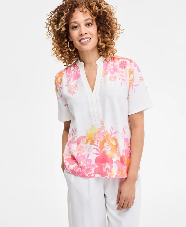 Jm Collection Women's Printed Linen Blend Split-Neck Top, Exclusively at Macy's