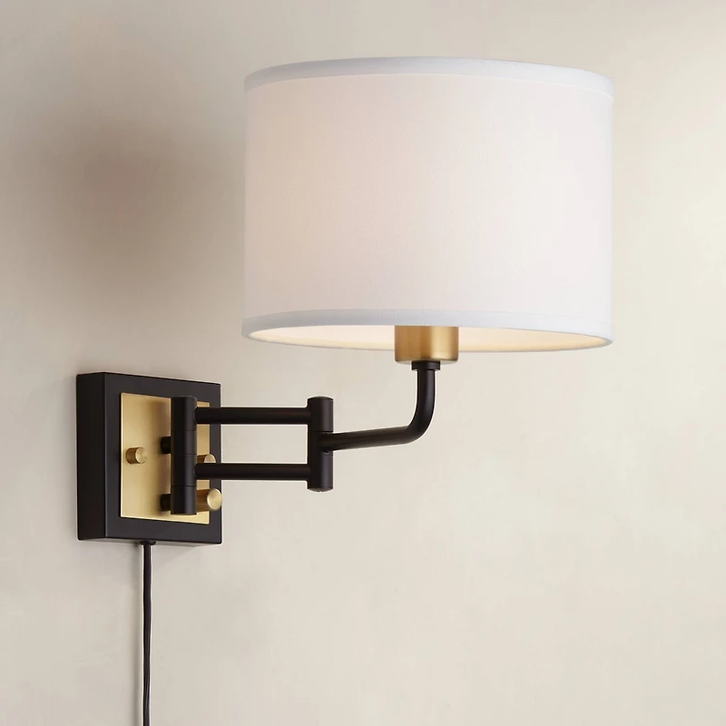 A classic design with contemporary sensibilities. This swing arm wall lamp is constructed of metal, with distinctive finishes of black and antique brass that provide a lovely contrast. A white drum shade provides a classic finishing touch. Perfect for a living room, bedroom, or personal library. A handy dimmer switch is built into the backplate.