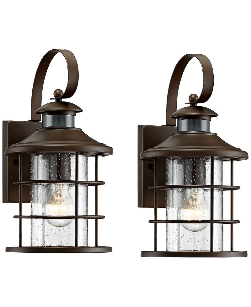 With an oil-rubbed bronze finish, this set of two Hogan motion sensor lantern outdoor wall lights by John Timberland naturally exudes richness and warmth. With seedy glass, this wall light is decorated with distinct and eye-catching detail. As a motion sensor, this light will turn on to inform you of any movement near your home, as well as provide lighting when you need to be outside after dark. Light turns on at 25% brightness and will brighten up to 100% brightness when motion is detected. Will go back to 25% brightness, one minute after motion is no longer detected.