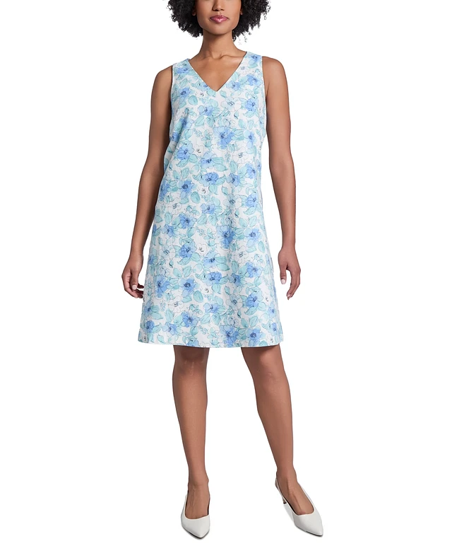 Jones New York Petite Linen-Blend Sleeveless Printed V-Neck Dress
