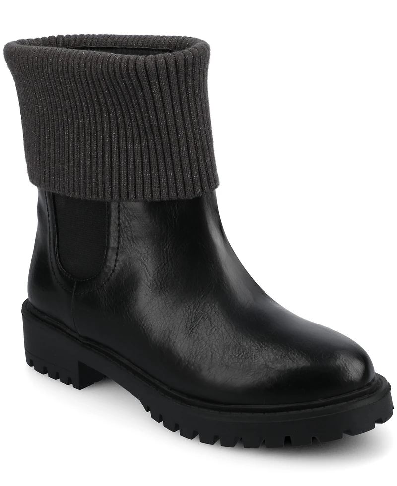 The Isabeau knit collar Chelsea boots by Journee Collection combine classic style with modern comfort. They feature a sleek faux leather upper, and a cozy knit collar for a unique touch. Designed with stretch gore panels, these pull-on boots offer a secure yet flexible fit, making them easy to wear. With a round-toe silhouette and a 4mm Journee Collection Comfort System Insole, they provide exceptional support and cushioning for all-day wear.