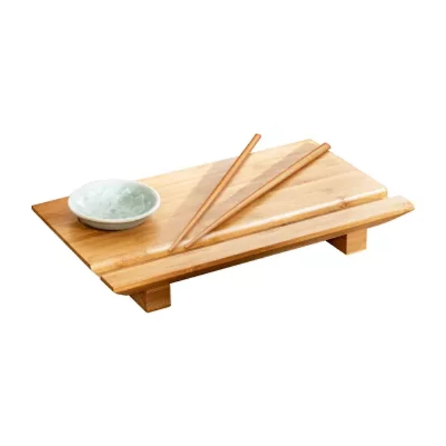 Joyce Chen 3pc Burnished Real Sushi Board Set. 3pc set includes a real sushi board, ceramic soy sauce dish, pair of chopsticks.