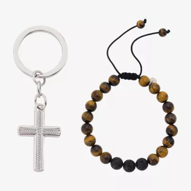 J.P. Army Bolo Beaded Bracelet & Keychain Mens Genuine Brown Tiger's Eye Stainless Steel Cross 2-pc. Jewelry Set