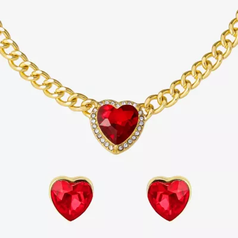 JS Jessica Simpson Gold Tone Collar Necklace  & Stud Earring Womens Multi Color Glass Heart 3-pc. Jewelry Set