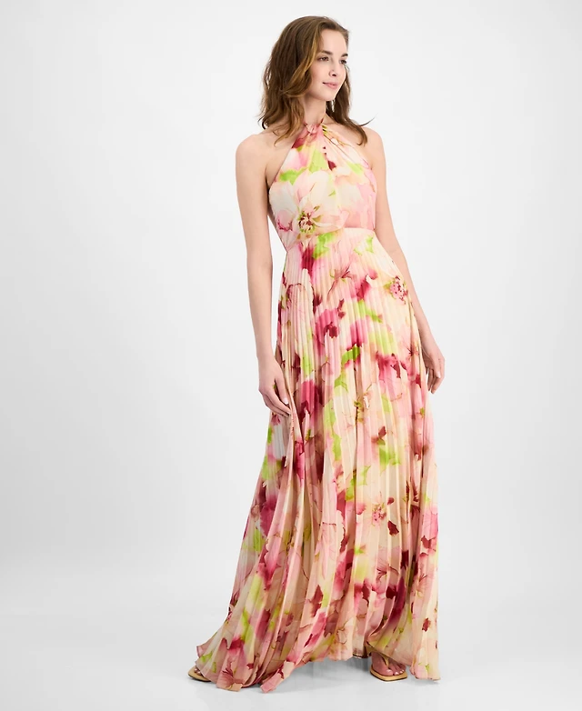 julia jordan Women's Pleated Floral Print Halter Maxi Dress