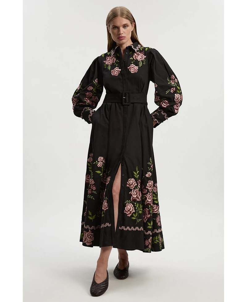This Karen Millen shirt dress masterfully blends artisanal craftsmanship with everyday wearability. The intricate rose embroidery transforms a classic silhouette into something truly special, whilst the cotton twill fabric ensures comfort throughout the day.
