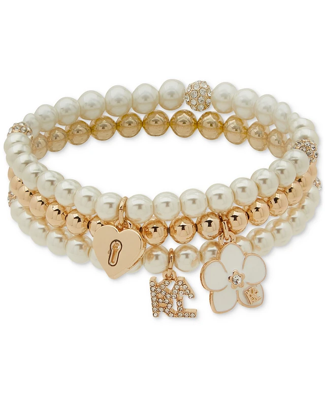 Karl Lagerfeld Paris Gold-Tone Imitation Pearl Three Row Charm Orchid Stretch Bracelet