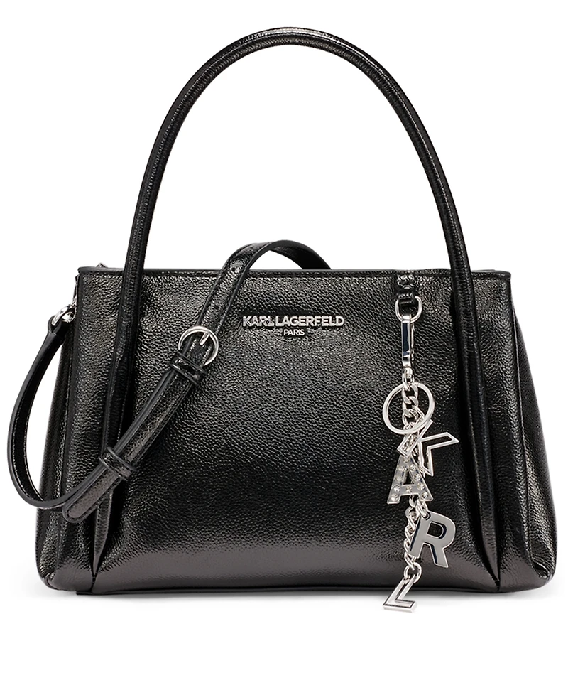 Organize essentials in this Karl Lagerfeld Paris shoulder bag featuring practical compartments. A top zipper with snap closure ensures secure access to the main interior space. Both exterior and interior pockets provide organized storage for various items. Double top handles and adjustable crossbody strap offer carrying options.