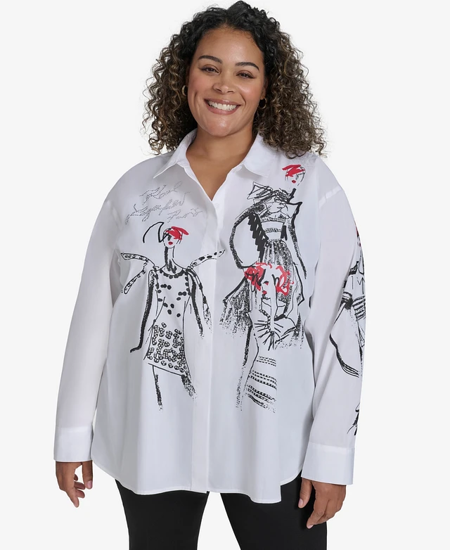 Karl Lagerfeld Paris Plus Sketch Girl Embellished Printed Cotton Button-Front Shirt, Exclusively at Macy's