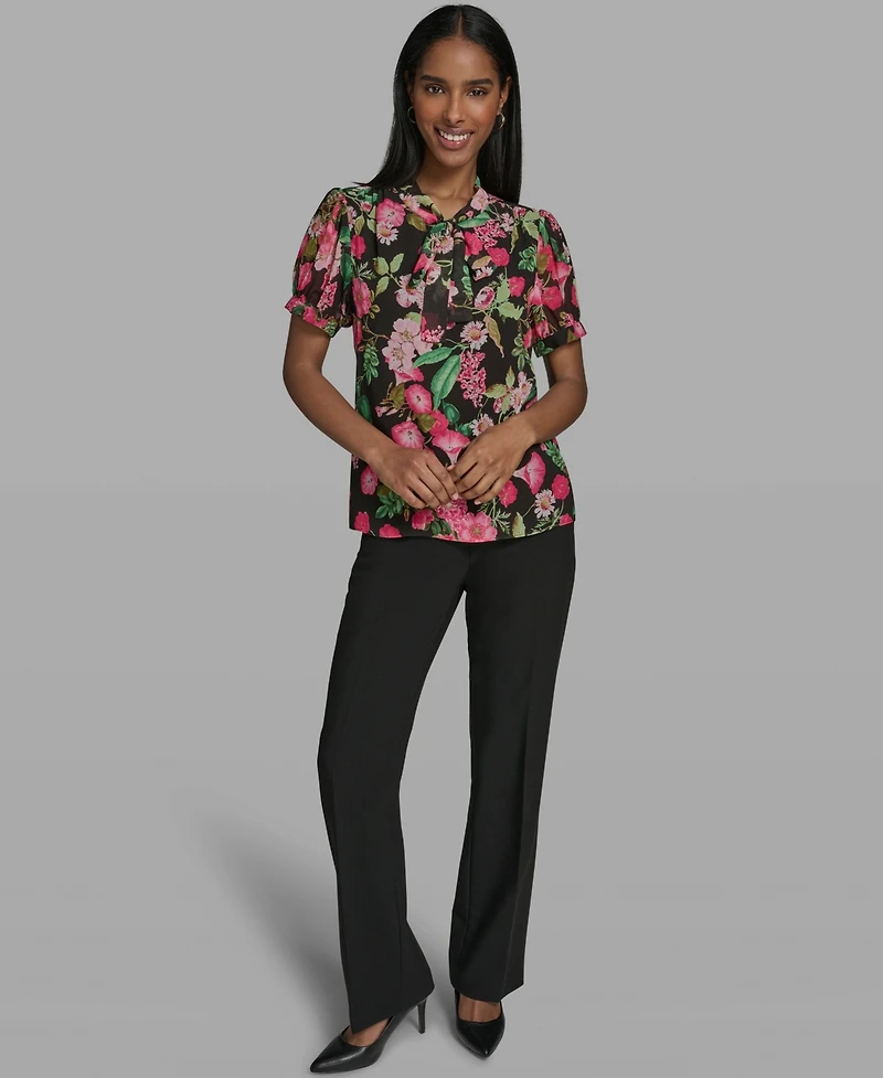 Embrace a feminine charm with this V-neck blouse from Karl Lagerfeld Paris, featuring short sleeves and a tie-neck closure at the front for a romantic touch. The lined construction and hip-length design create a polished silhouette.