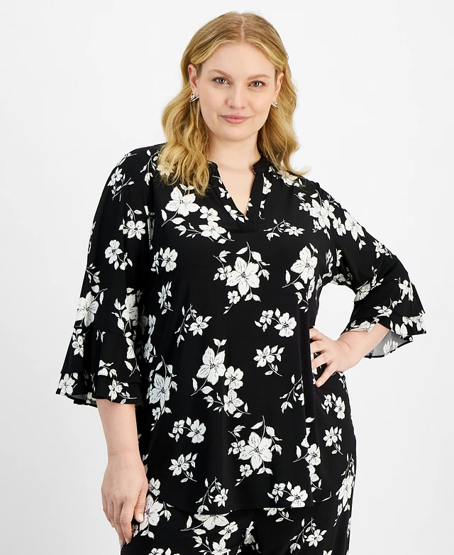 Kasper Plus Size Split-Neck Floral Flutter-Sleeve Top