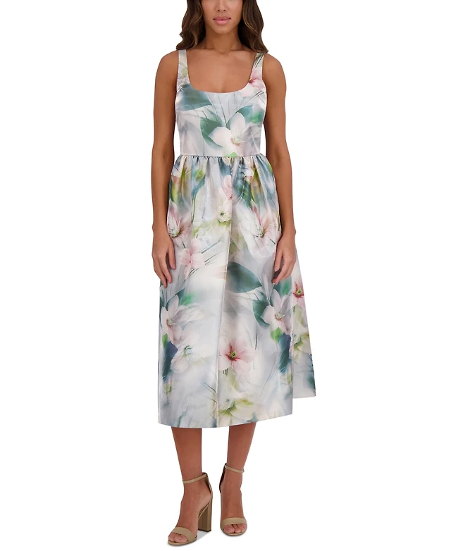kensie Women's Printed Shimmer Twill Scoop-Neck Midi Dress